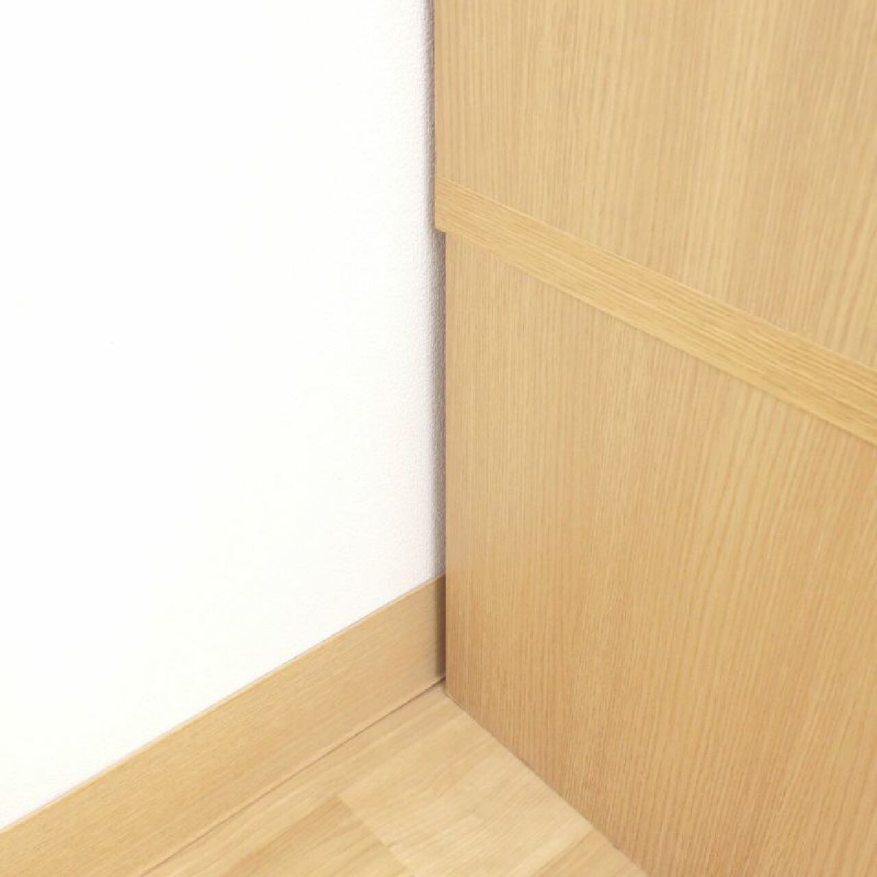 上部が背面に少し出ているので、背板と壁の間に隙間ができます。配線を通したり、巾木をよけたりできる構造です。