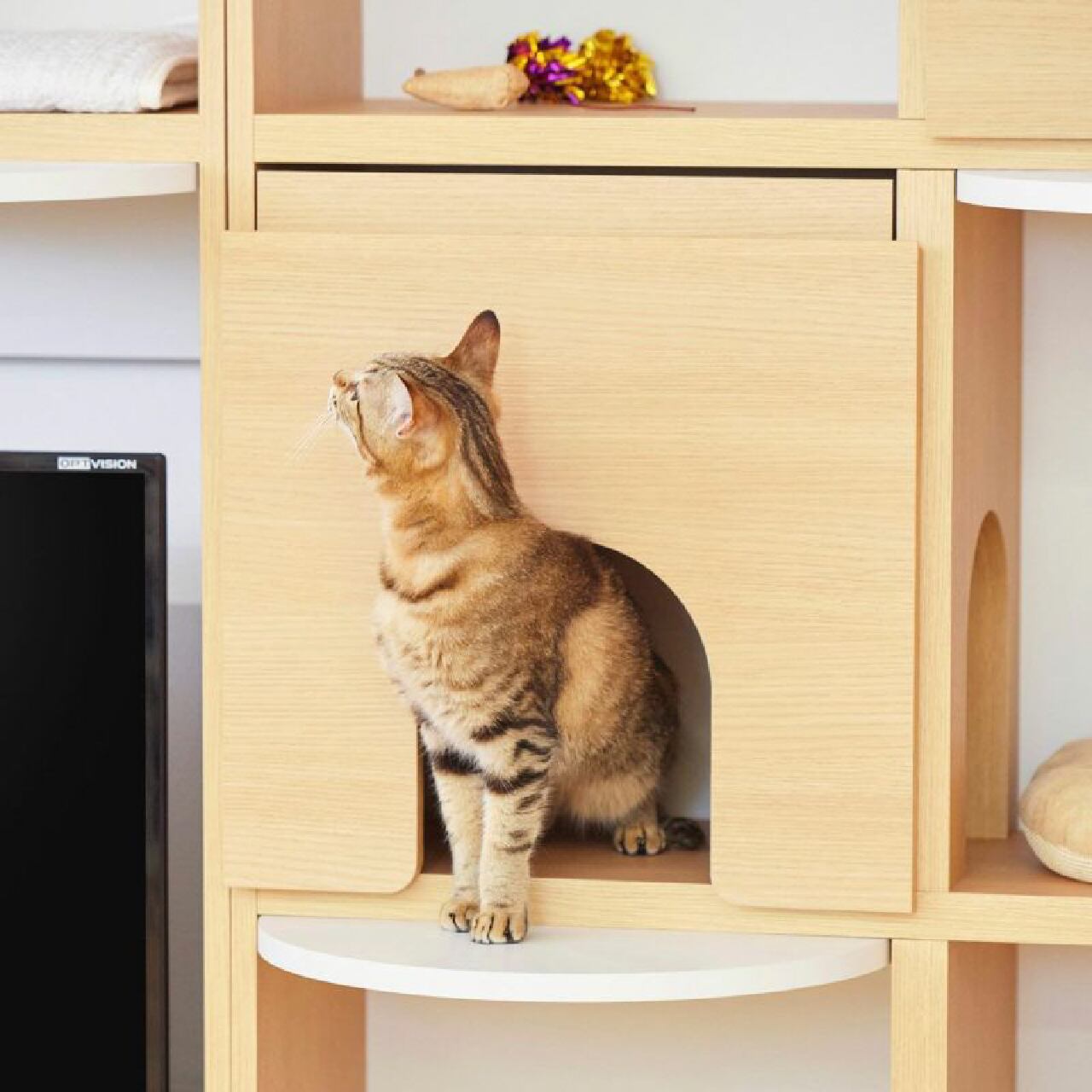 穴なしの扉を使えば、猫ちゃんが入れない収納スペースをつくることができます。人のリビング収納や、フード・猫砂・おもちゃなど猫ちゃんグッズの収納場所になります。