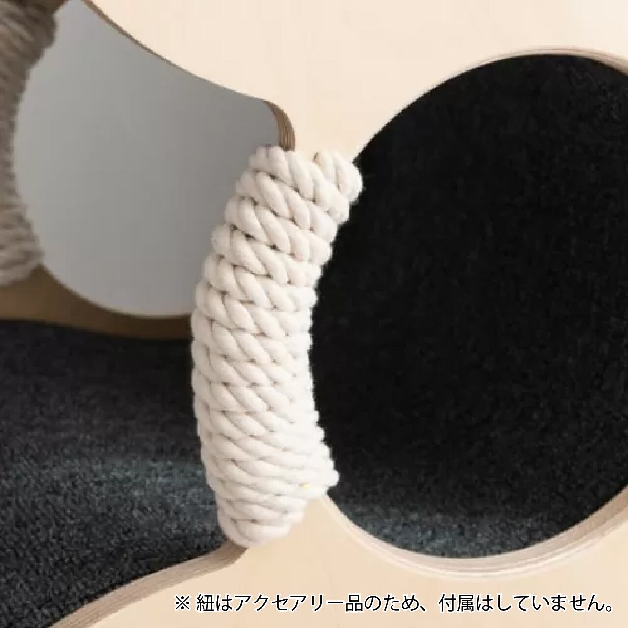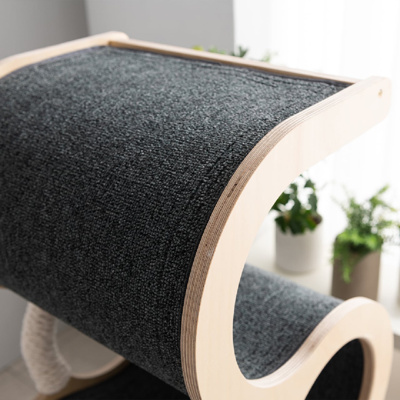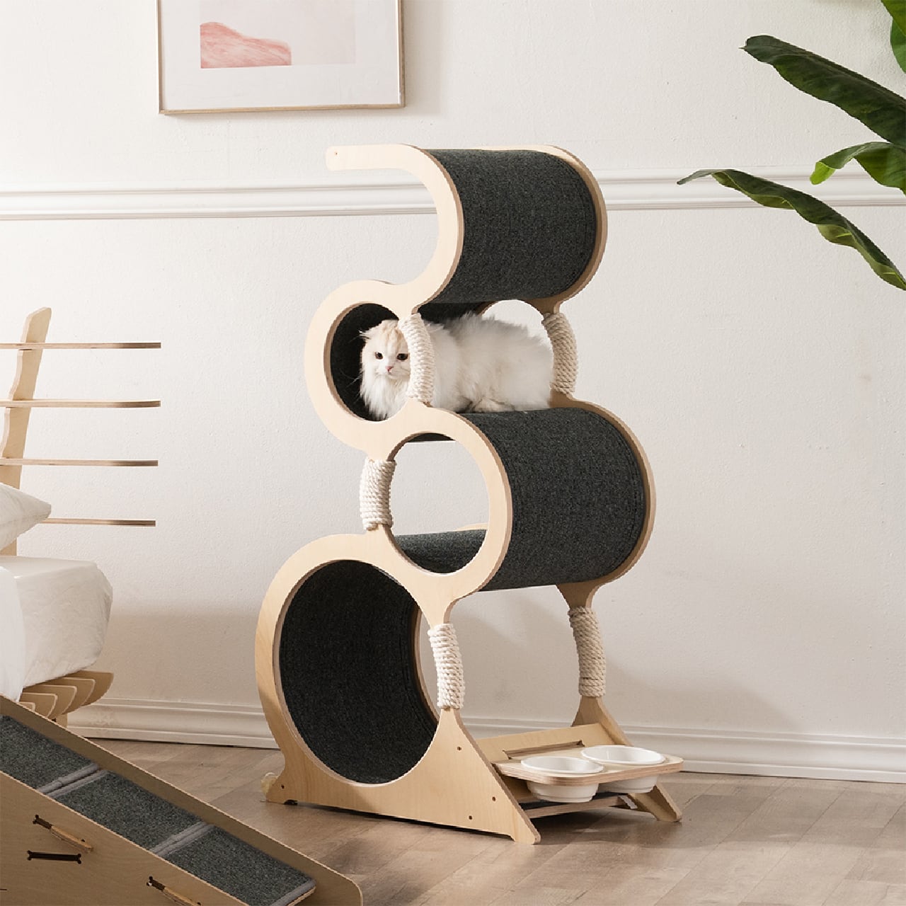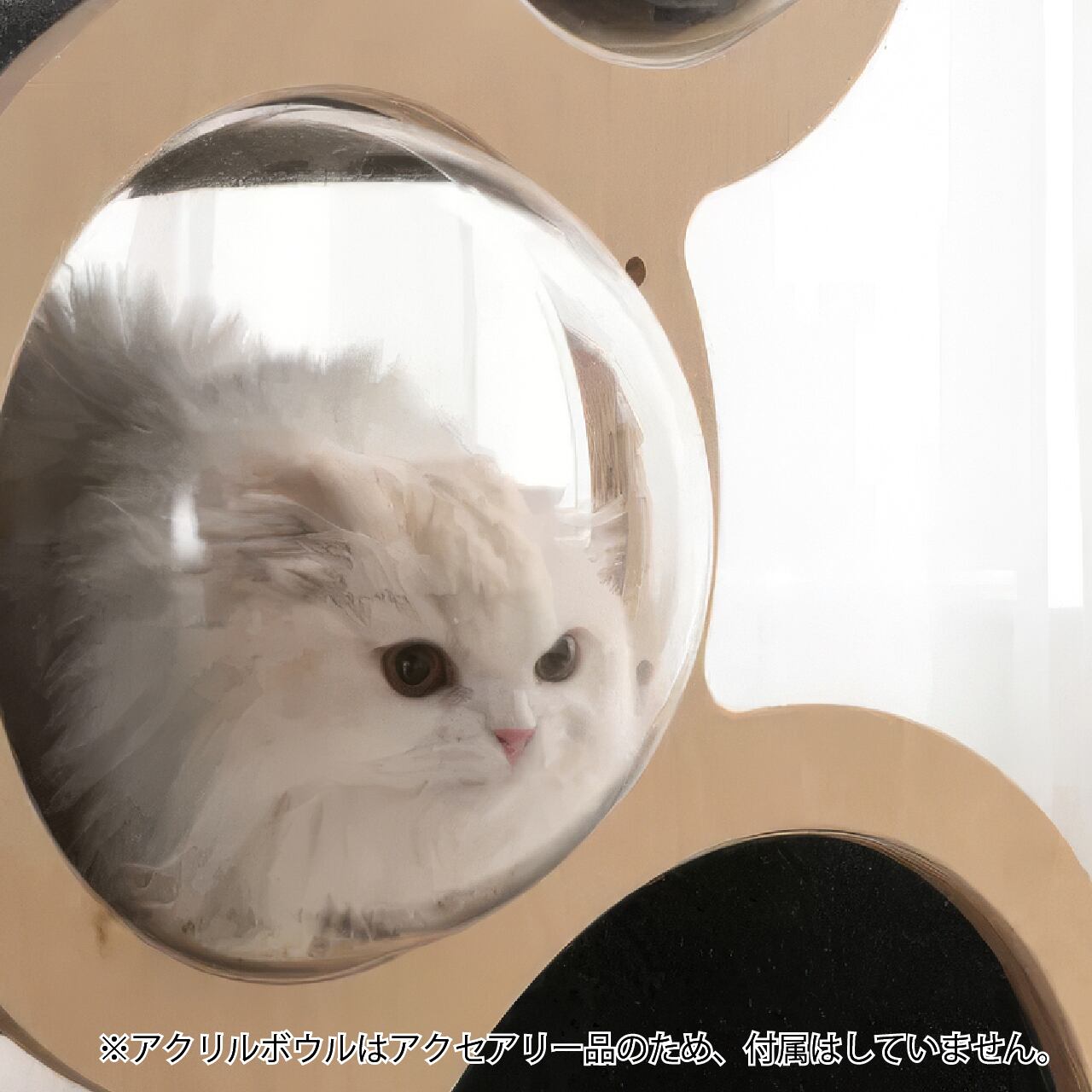 天然木によって覆われた外観と美しい曲線は、猫のプライベート空間をつくりながらインテリアへ溶け込むように機能しています。 奥行きがありつつも開放的な構造が、猫と人の気配をほど良く繋げ、一体感を感じられるようになっています。